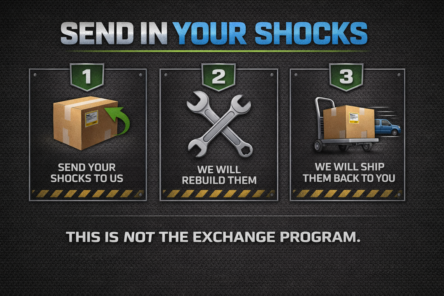 We will reuse your packaging to send them back, unless it is damaged or shocks will not fit. We recommend shipping in a heavy-duty box WITHOUT SPRINGS AND ACCESORIES. Please wrap each shock individually to prevent damage to shock bodies/shafts and place thick cardboard, plastic, etc. over the ends of front shafts to prevent them from piercing through the box. Secure with Gorilla tape, duct tape, or any HD tape all the way around the box, on all sides. We Recommend FedEx for shipping. Please ship shocks WITHOUT SPRINGS.